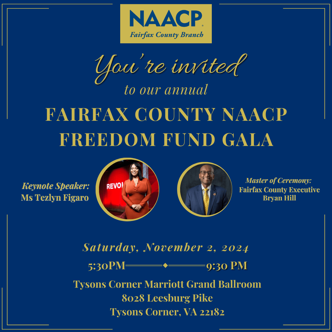 | Tickets are now on sale for the Fairfax County NAACP’s 2024 Freedom Fund Gala, Together We Rise. Join us on November 2, 2024, at the Tysons Marriott in Tysons Corner, Virginia, from 5:30 to 9:30 PM. This annual event is our largest fundraiser, bringing together members, friends, and supporters for a powerful evening of celebration and recognition.