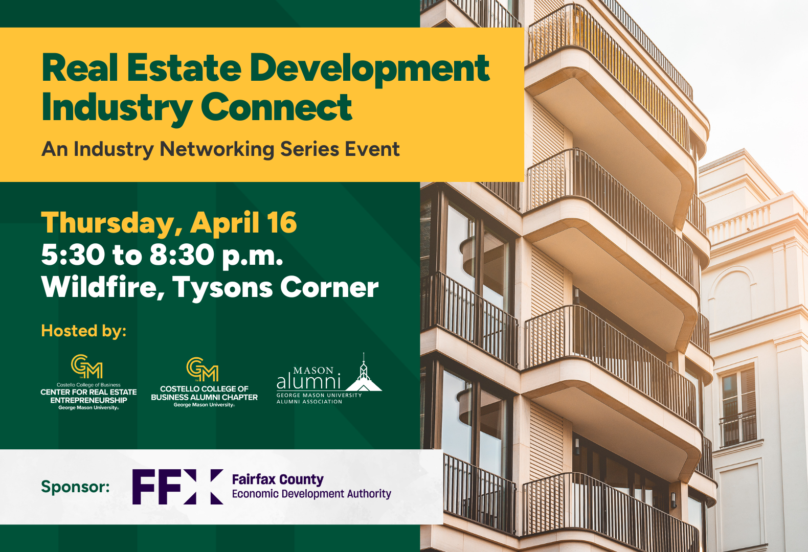 Join fellow George Mason alumni in the Real Estate Development Industry for networking in Tysons. Sponsored by the Costello College of Business Alumni Chapter and Center for Real Estate Entrepreneurship, this event will bring together industry experts from our George Mason community for meaningful conversation and connections!